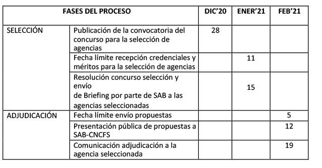 ALMENDRAVE y CNCFS realizarán la selección de un máximo de cinco agencias y un mínimo de tres el 15 de enero de 2020. ALMENDRAVE y CNCFS comunicarán por correo electrónico a todas las agencias el fallo del concurso de selección. ALMENDRAVE y CNCFS remitirán a las agencias seleccionadas un Briefing con información complementaria a la comprendida en la presente convocatoria.