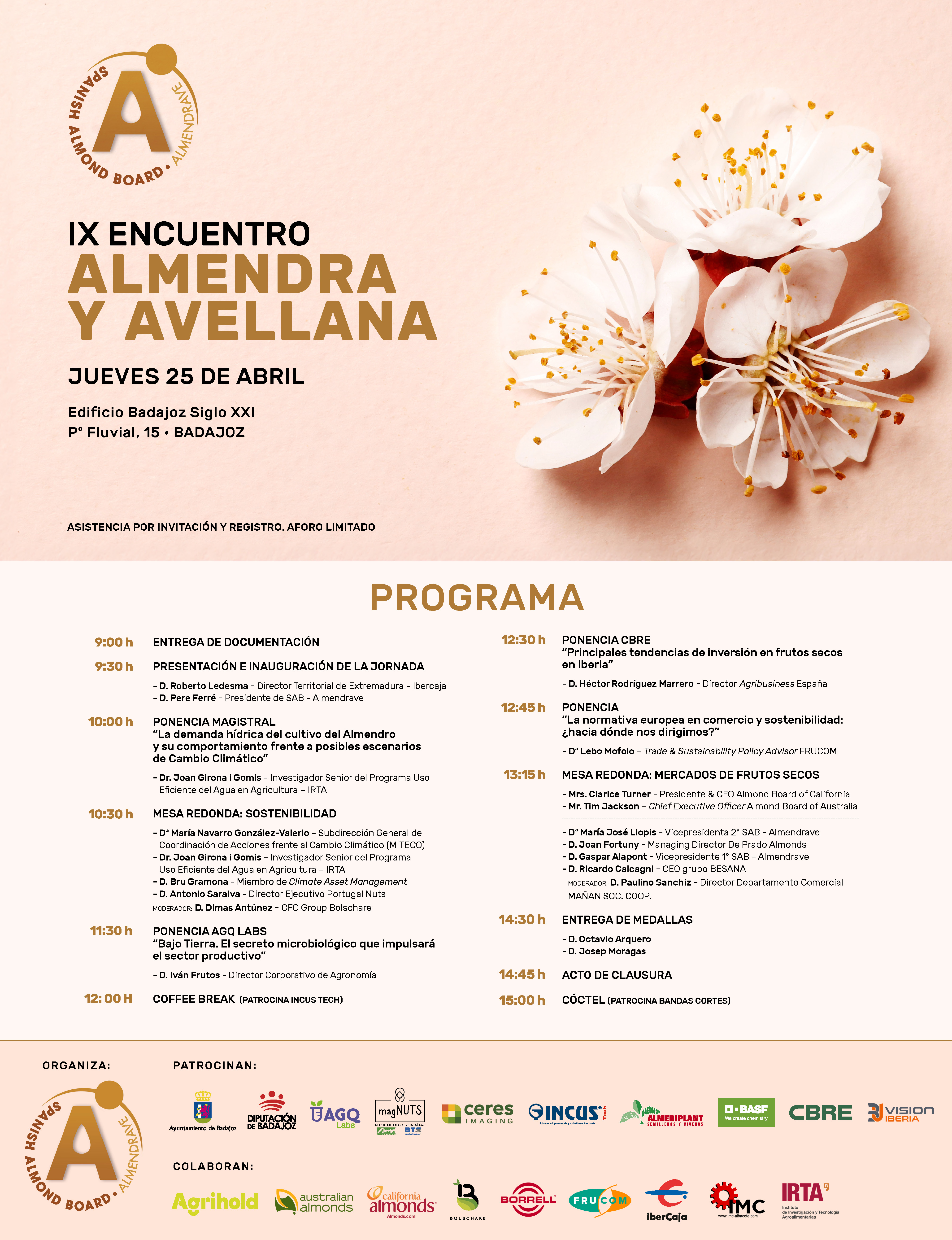 El IX Encuentro de la Almendra y la Avellana, que se celebrará en el salón de actos del Edificio Badajoz Siglo XXI, cuenta con el patrocinio del Ayuntamiento y la Diputación de Badajoz, AGQ Labs, Bandas Cortés, Ceres Imaging, Incus Tech, Almeriplant, BASF, CBRE y 3U Visión Iberia, así como la colaboración de Agrihold, las Almond Board de California y Australia, Bolschare, Borrell, FRUCOM, Ibercaja, IMC Albacete y el IRTA.