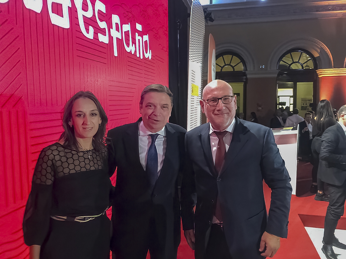 Imagen del Ministro de Agricultura, Pesca y Alimentación, D. Luis Planas Puchades, junto con el Presidente de SAB-Almendrave, D. Pere Ferré y Dª. Minda Tabuyo, del Secretariado de Almendrave y Aeofruse. Tomada durante la entrega de los premios Alimentos de España, evento al que acudimos en apoyo de un sector alimentario español sostenible y eficiente.